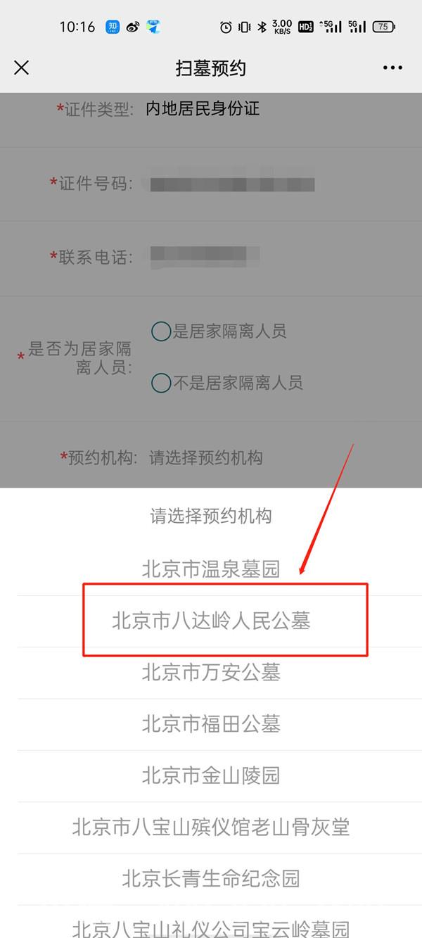 6.预约机构选择“北京八达岭人民公墓”,然后根据提示完善个人信息并提交。