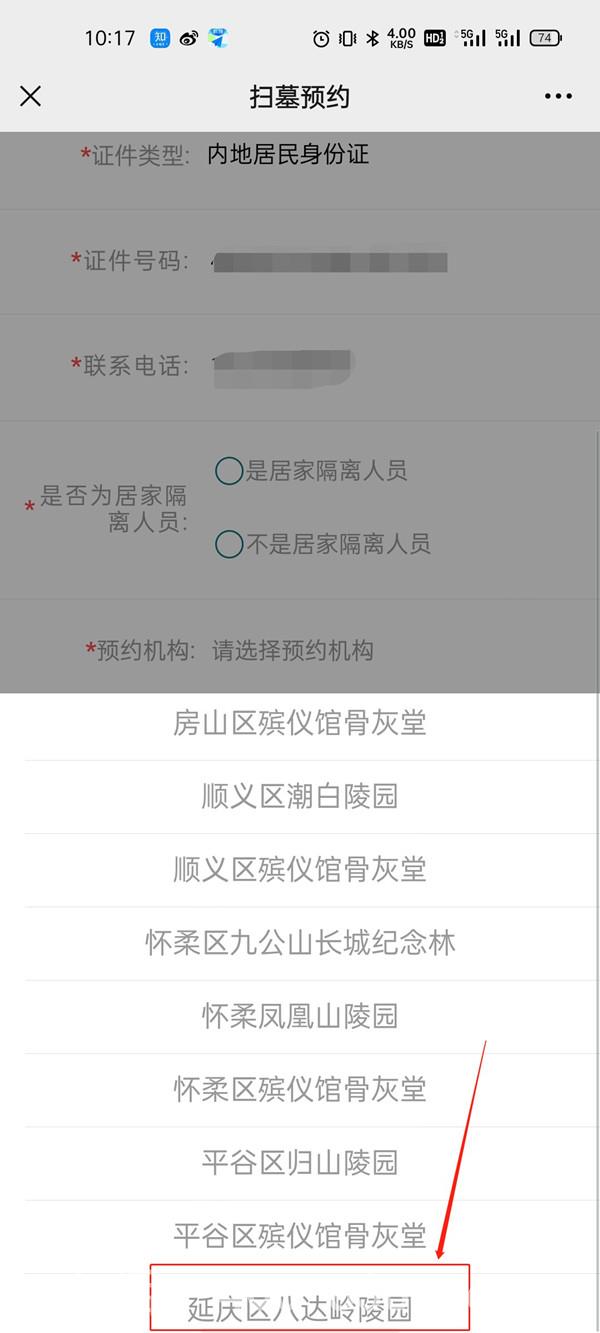6.预约机构选择“八达岭延庆区公墓”,然后根据提示完善个人信息并提交。