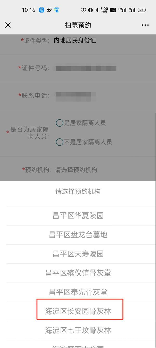 6.预约机构选择“骨灰Forest,长安园,市海淀区”,然后根据提示完善个人信息并提交。