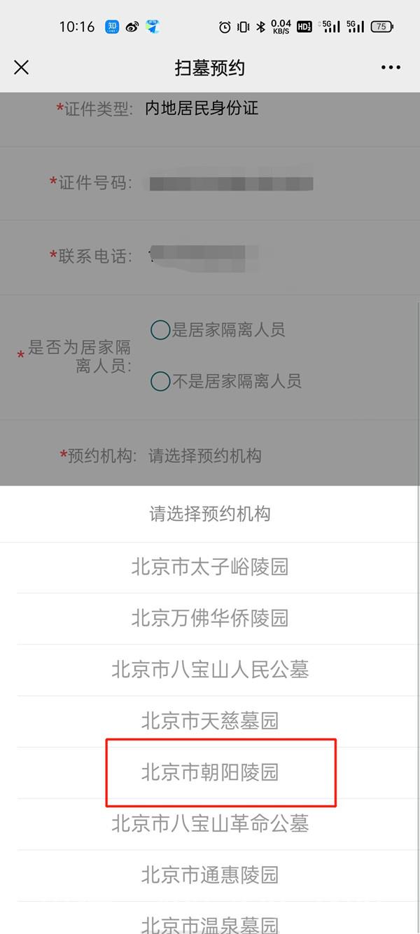 6.预订机构选择“北京朝阳陵园",”后根据提示完善个人信息并提交。