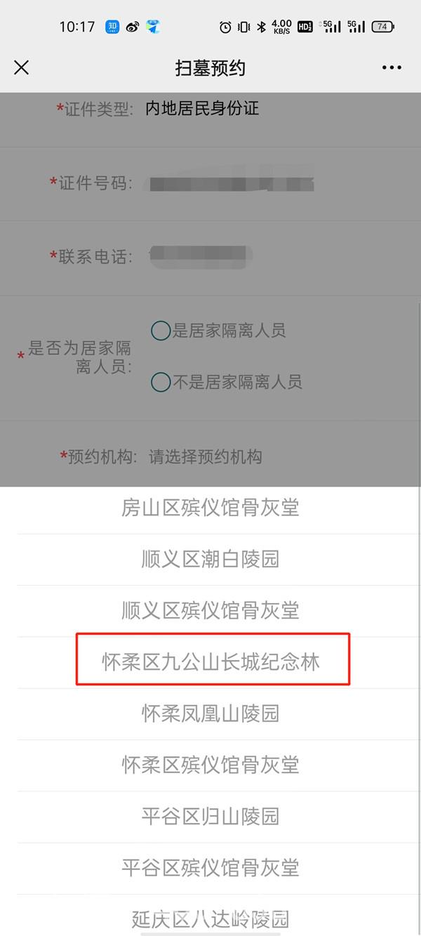 北京市九公山长城纪念林,市怀柔区,可通过微信搜索“北京民政”,关注“北京社会建设与民政”微信官方账号,预约扫墓。以下是具体流程: