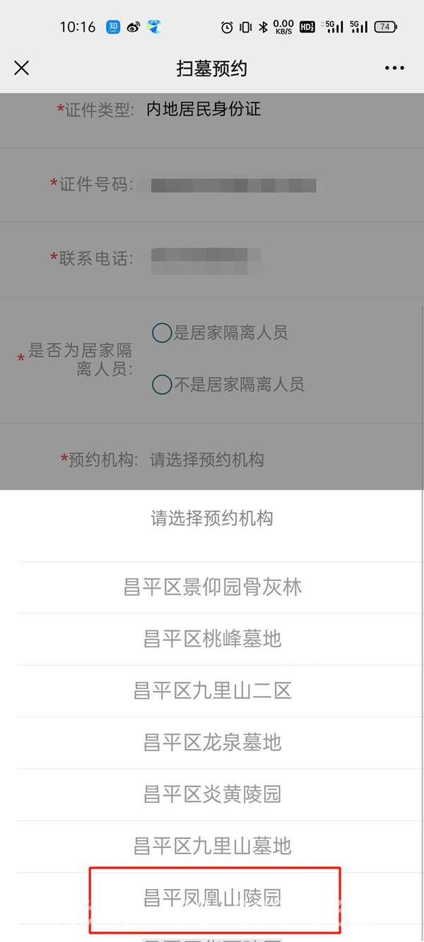 6.预约机构选择“凤凰山昌平区公墓”,然后根据提示完善个人信息并提交。