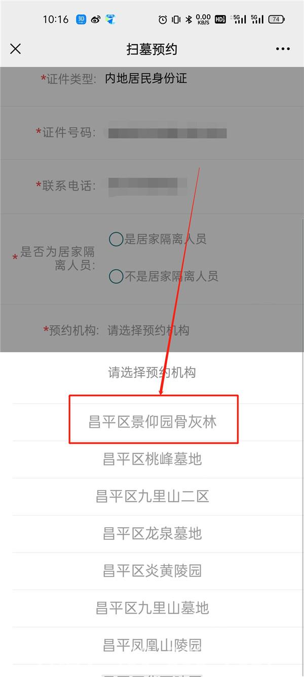 6.预约机构选择“骨灰Forest,景仰园,市昌平区”,然后根据提示完善个人信息并提交。